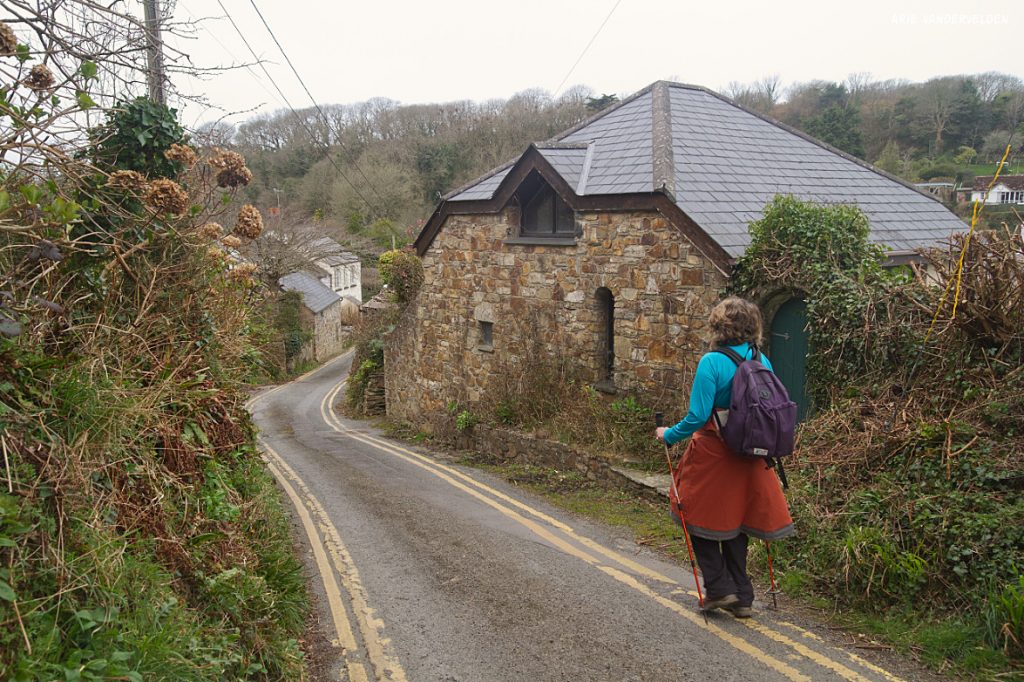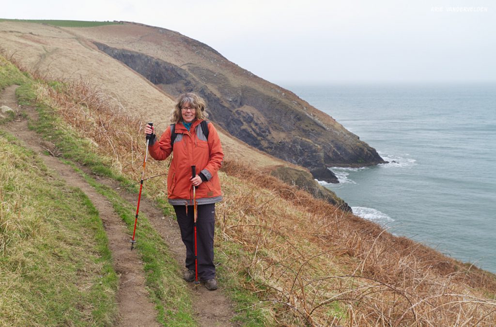 In the morning we caught some news headlines. The storm had downed powerlines, blown trees on the train tracks causing disruption, and ferry crossings to Ireland had been cancelled. However, the weather this morning was much better than the day before. It was overcast, but the winds were much more manageable. We hiked along the trail, winding our way around small headlands and coves.