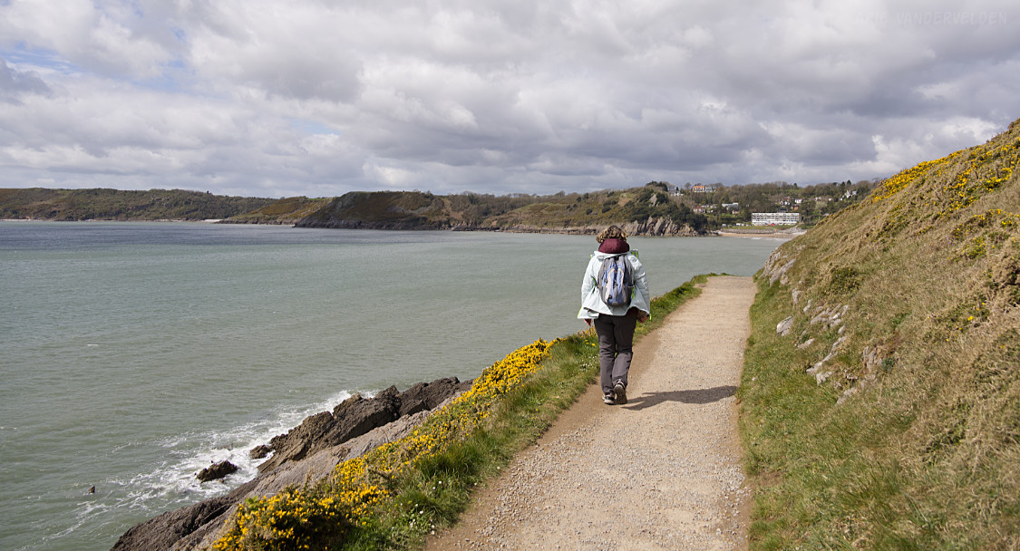 Mumbles is the gentler and touristy side of Swansea. This small town lies at the far end of Swansea Bay, and getting there simply involves hiking the glorious beach and seafront pathway for 4.4 miles (7 km). We had a few false starts – we got ready to go, only to be pelted with heavy showers shortly after leaving, which had us retreating back to our apartment. But by mid-morning the showers let up and we were on our way. Here is Diana on the beach in front of our apartment complex.