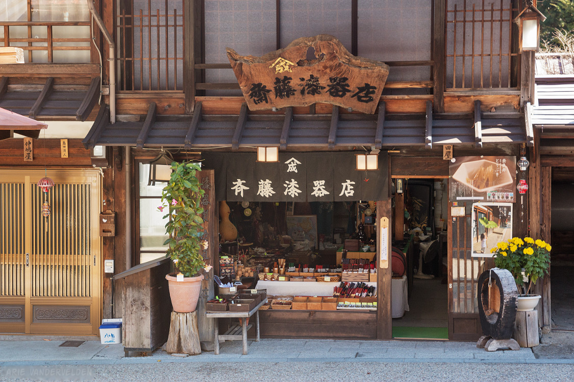 Past Nagase, we followed the highway for a short distance, crossed on a crosswalk, and walked along a service road to the entrance of Hirasawa. Hirasawa is a pretty town along the Nakasendo road. Harsh afternoon light stymied my efforts to photograph it. Hirasawa is a town known for its laquerware, and there are many shops in town selling just that.