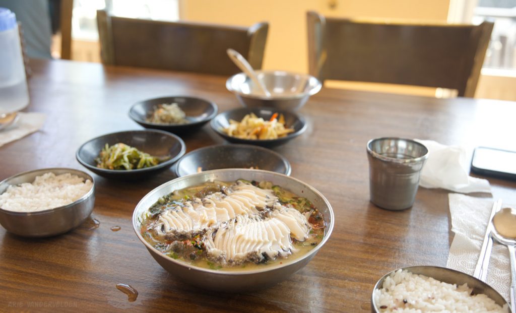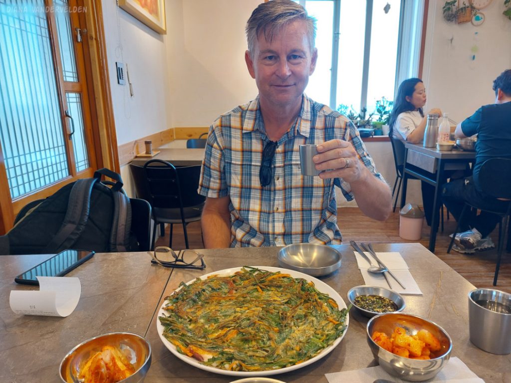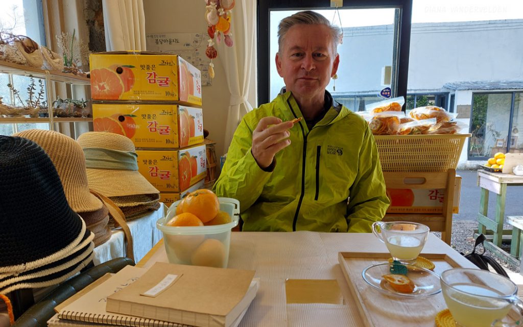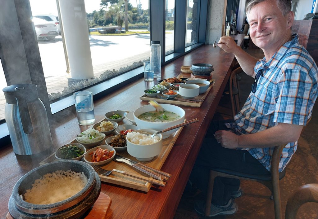 We stopped for lunch at a restaurant specializing in okdom. The waiter spoke decent English, but he went and got the chef whose English was flawless. The chef explained that Okdom is called Red Tilefish in English, that red tilefish is a Jeju specialty, and that his restaurant specializes in different preparations of this species of fish. Diana tried it as a fish soup, and I had fried fish. Oh my it was good – the fish was expertly cooked, of course. The flesh was very delicate in flavour. The side dishes added a variety of sour, salty, spicy, and sweet notes. We finished every morsel, and we congratulated the chef before we left.