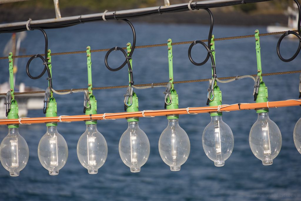 Most Jeju fishing vessels have strings of lights. These lights attract squid and fish at night, which are then scooped up using nets on side booms. This is much more environmentally friendly than bottom-trawling or gill-net fishing.
