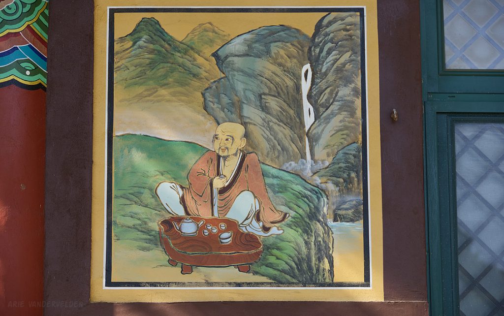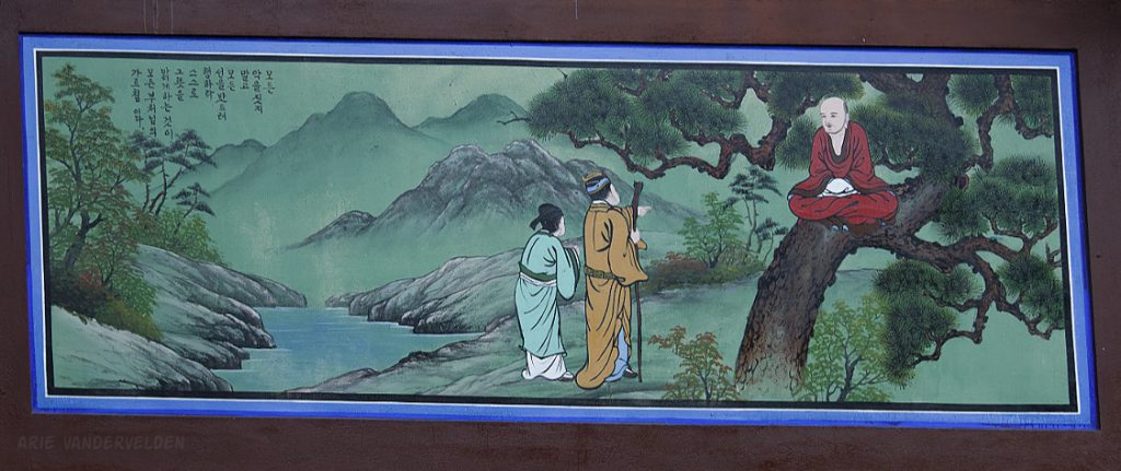 There were frescoes painted on the sides of the building, most of them depicting scenes from the life of the Buddha. Paintings of this type are common on Korean Buddhist temples, but I found these ones to be particularly evocative and well done. Here are two people consulting the Buddha.
