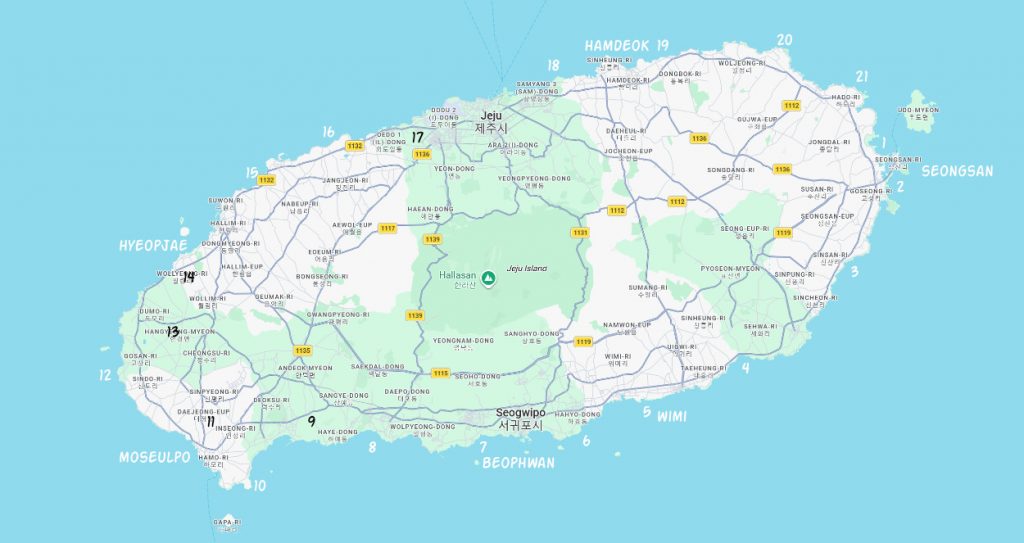 Here is a map of Jeju Island, showing the Olle trails (numbers) and places we stayed.