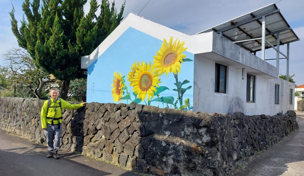 Olle 1 tours around the eastern town of Seongsan and its surrounding hills. We started our day by turning left (north), hiking along the shoreline to the village of Jongdal-ri. This is an artsy little village with some interesting floral murals.