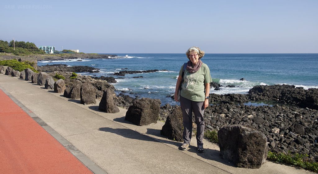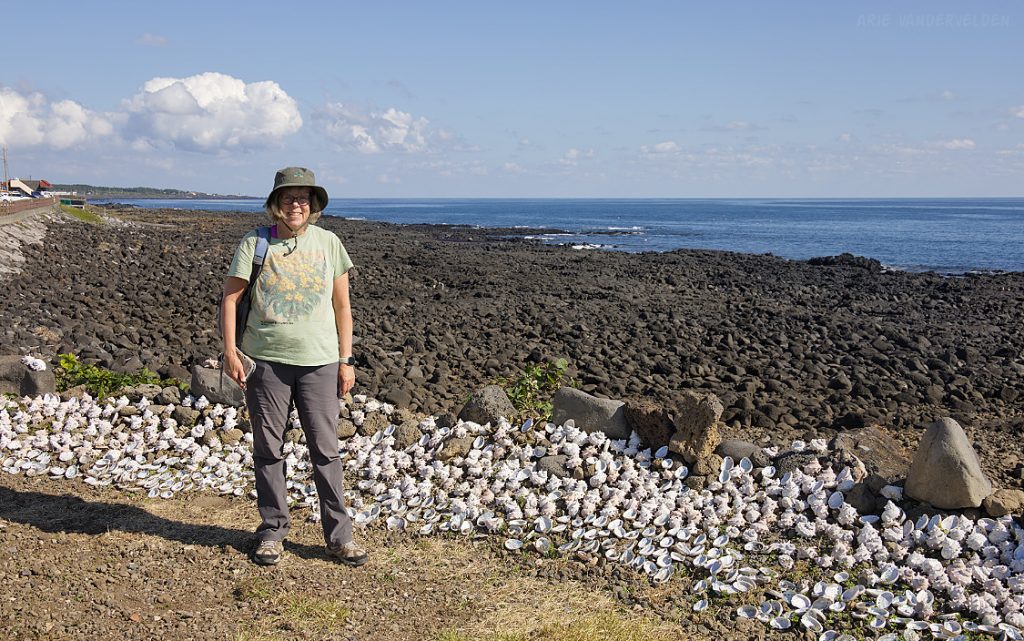 A bit further on was an area where the shoreline had pastureland behind it. It was a unique spot on Jeju – in most places are vegetable cops, or houses, or fish farms, or ramshackle roads. This was one of the few areas we encountered with grasses. The local name for it is Sinpung Sincheon Bada Mokjang. The place is popular with newlywed couples, who come here to have their pictures taken.