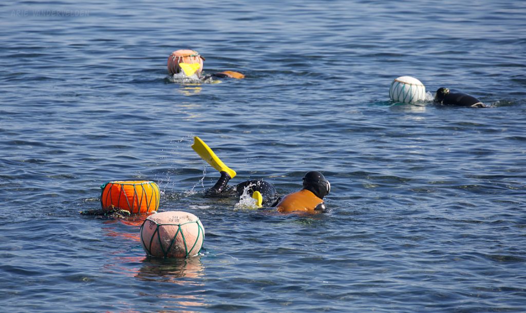 Each of the Haenyeo has a float, a net for holding the catch, and a number of tools to catch crustaceans and to pry shellfish from the rocky seafloor.