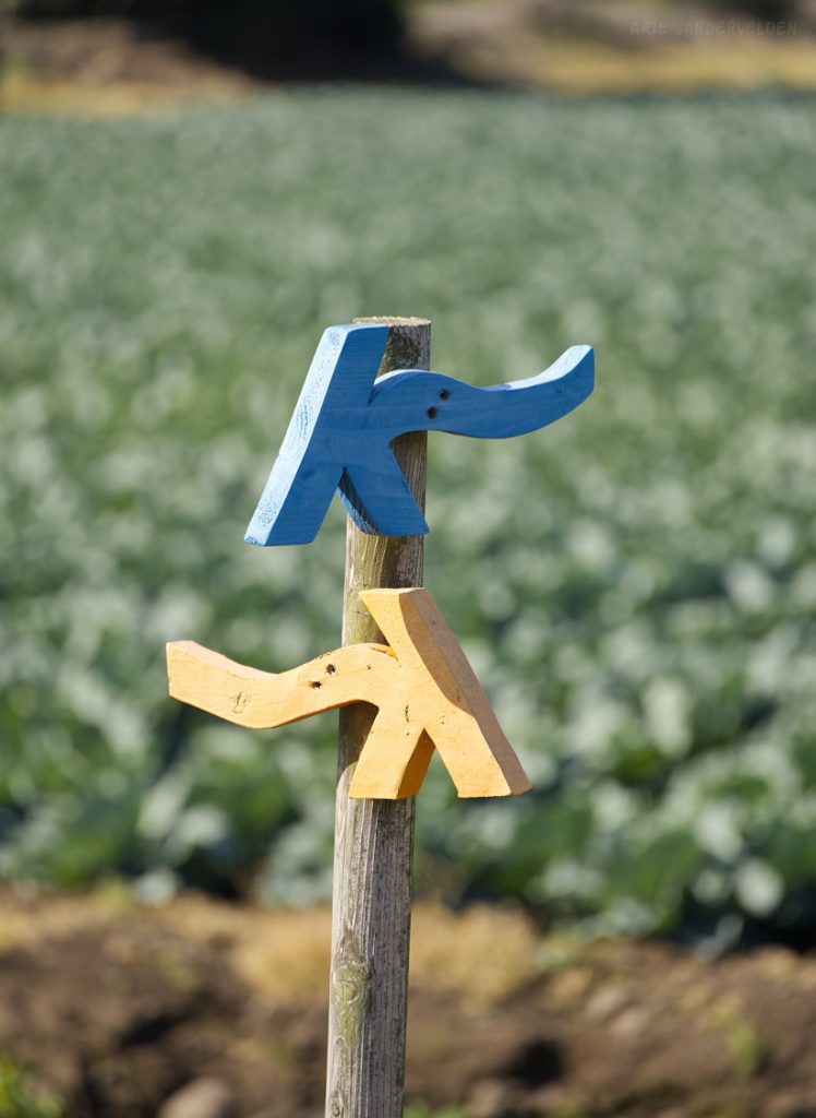 Olle signpost with a cabbage field in the background.