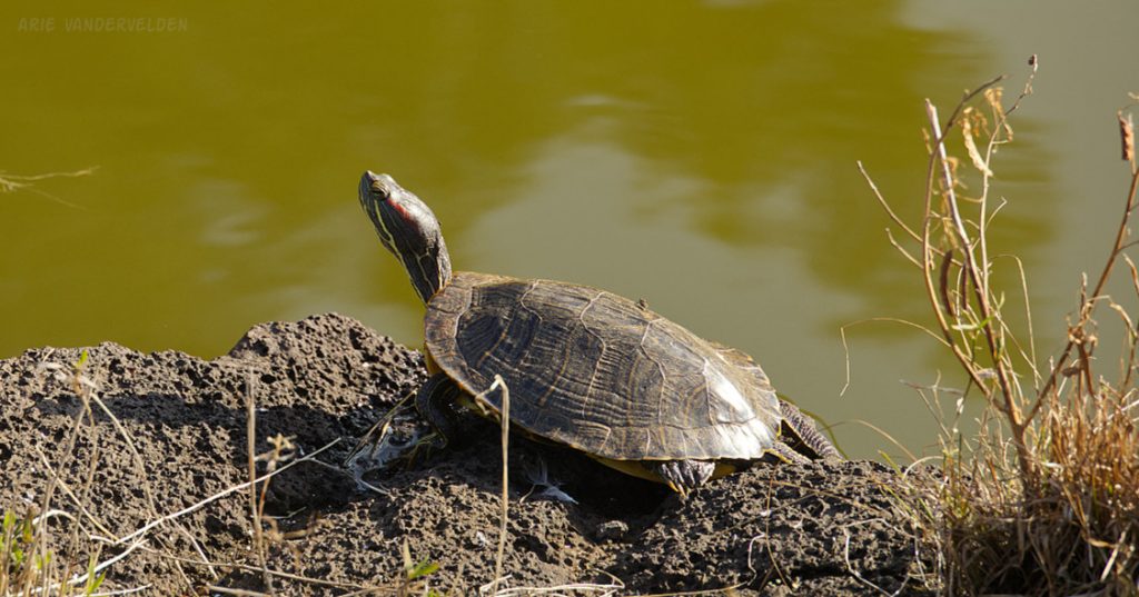 This turtle was sunning itself on the bank of the pond.