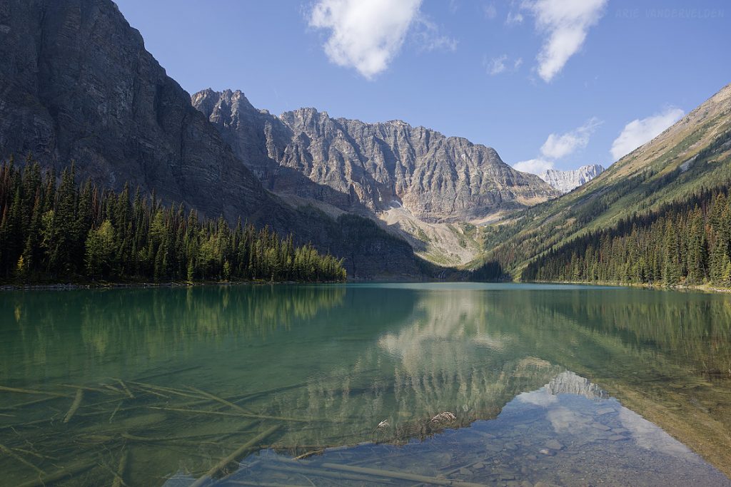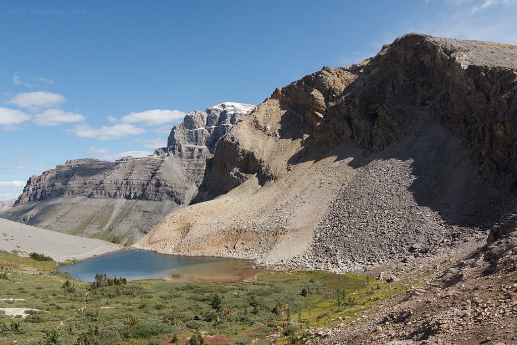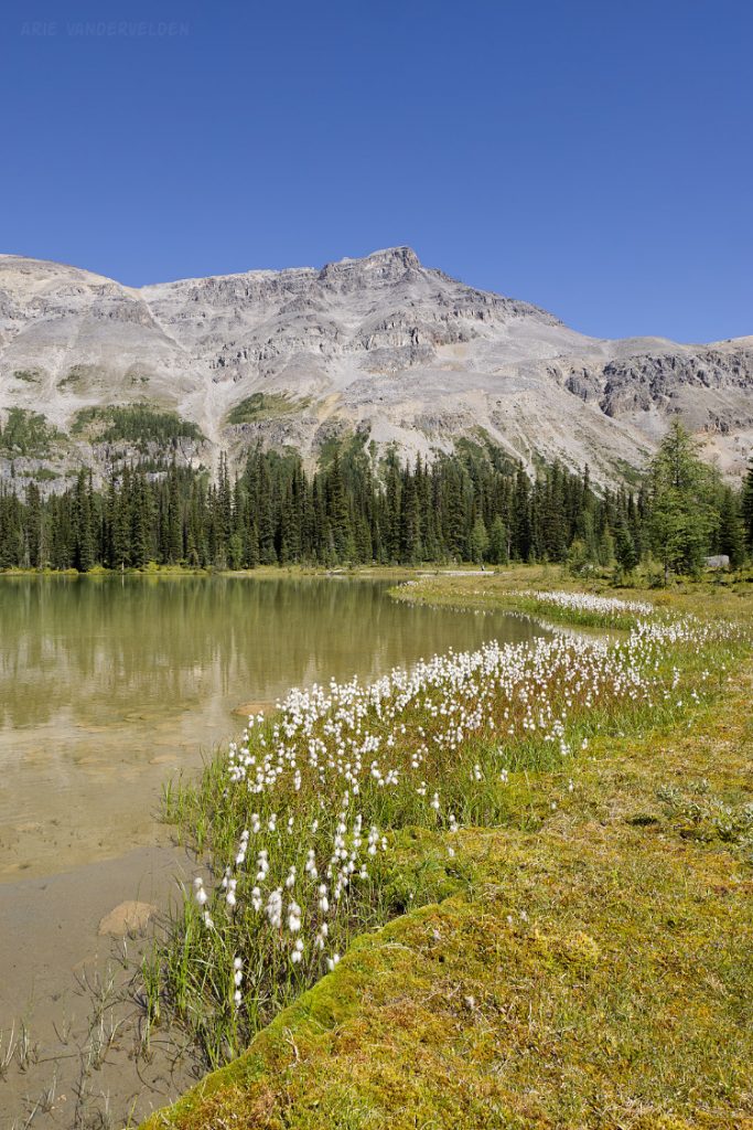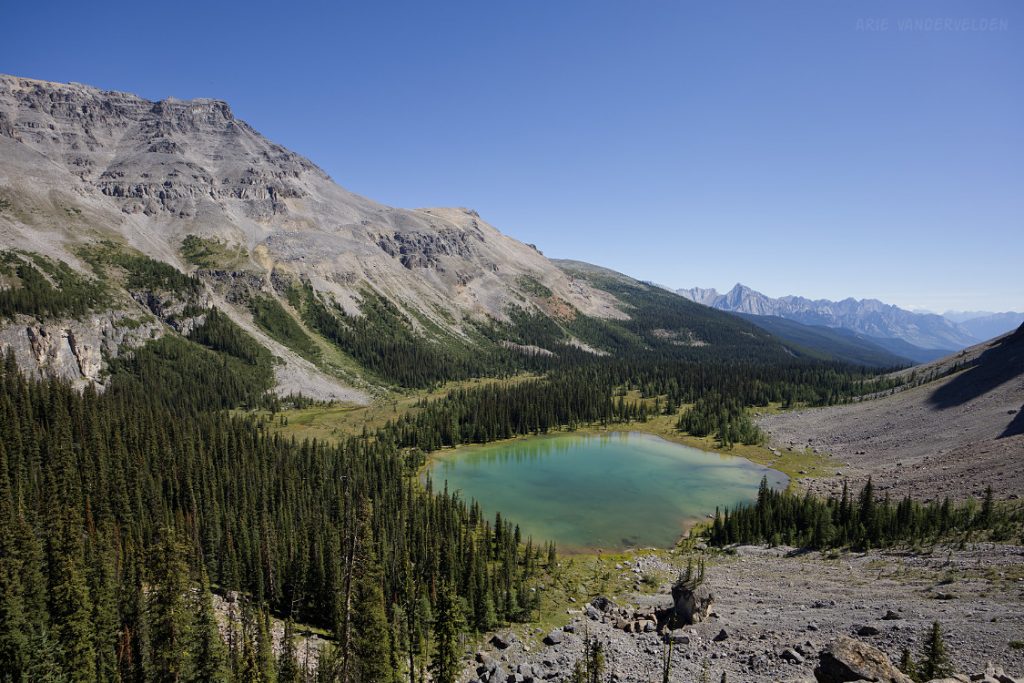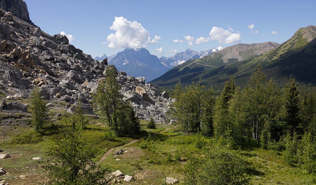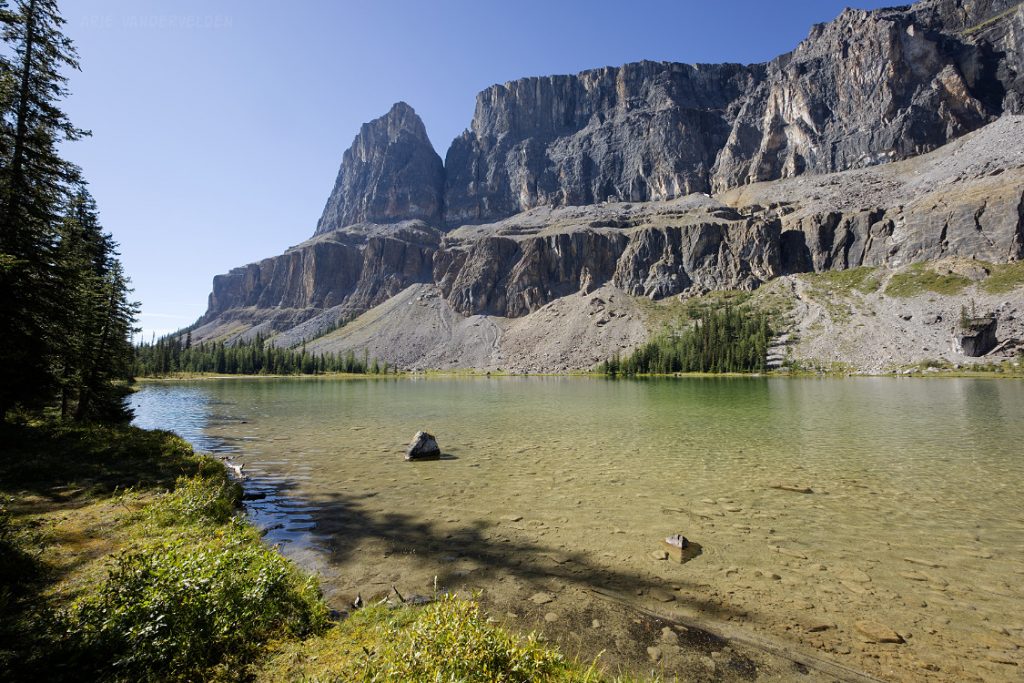 From the top of Vermillion Pass on Highway 93, a trail leads down to Vista Lake. Yes, down – this is one of the few trails in the Rockies where you start by hiking down. There is a nice view of Mount Whymper at the end of the lake.