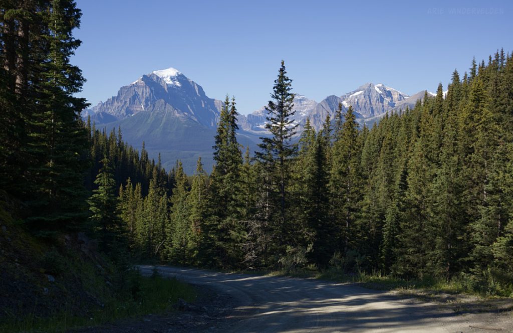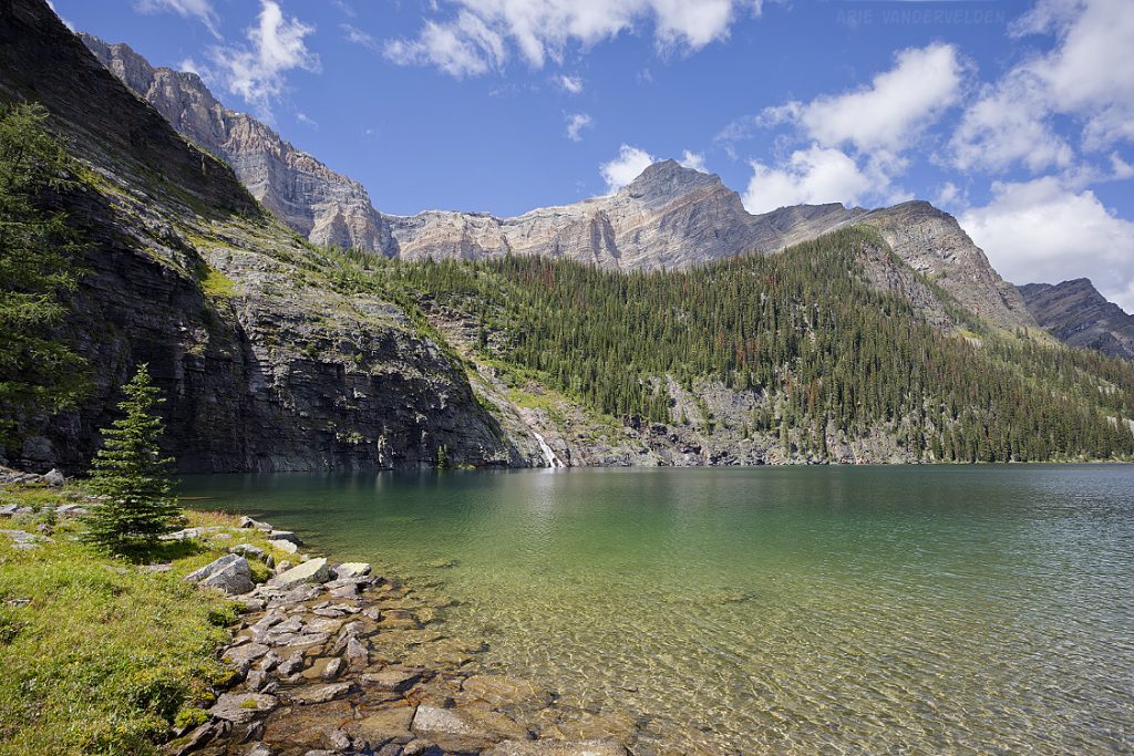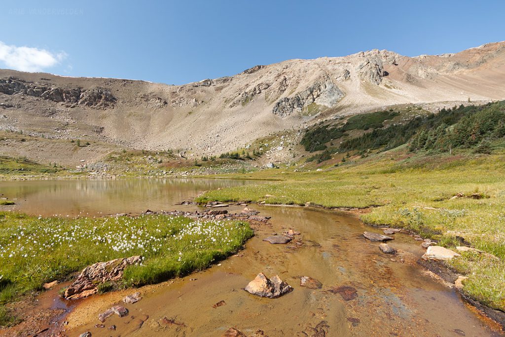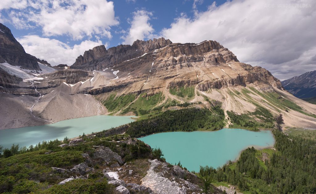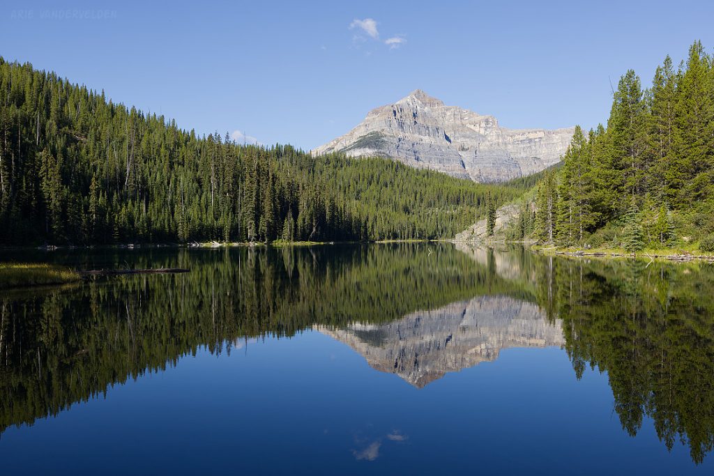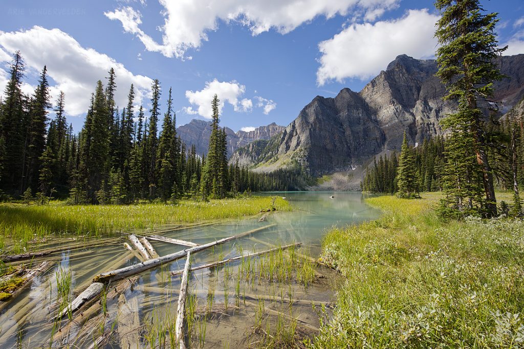 From the top of Vermillion Pass on Highway 93, a trail leads down to Vista Lake. Yes, down – this is one of the few trails in the Rockies where you start by hiking down. There is a nice view of Mount Whymper at the end of the lake.