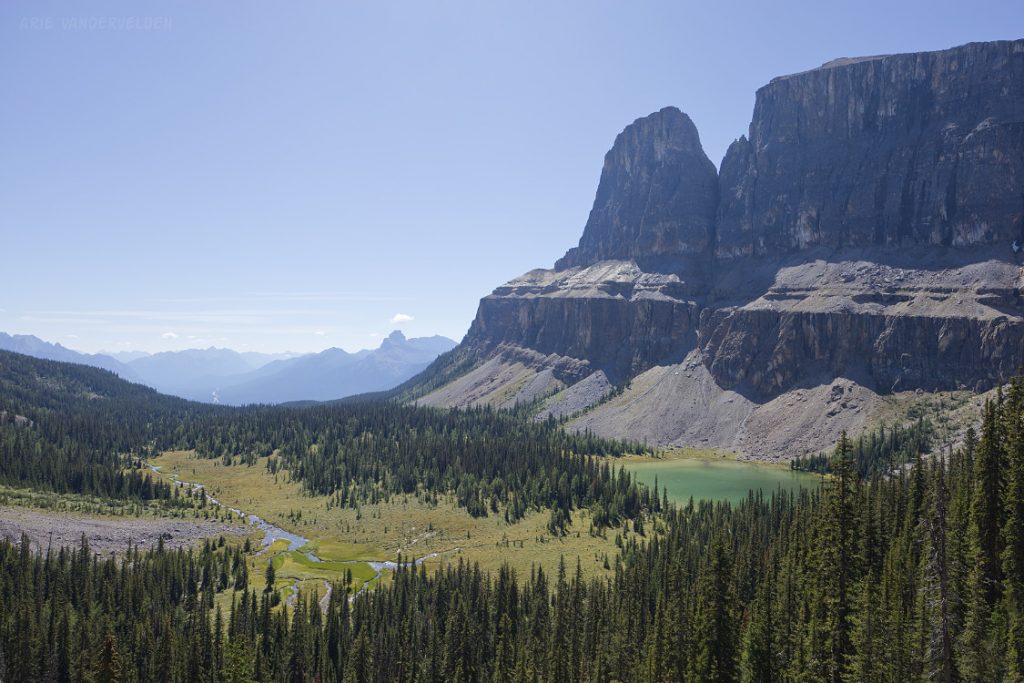 Next I followed the dried-up outlet stream from the lake to the point where it pours over the lip of the headwall. There is a nice view of Tower Lake, Castle Mountain, and the Bow Valley with Pilot Mountain being visible in the distance.